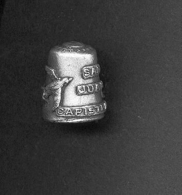 Pewter Souvenir thimble. Raised map of California, swallow , mission buiding and ÒSan Juan CapistranoÓ Square knurling on rounded top.No marks.