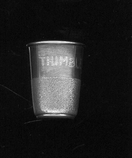 Silver drinking measure type thimble. Rolled rim. wide plain band one half the height of the thimble with ÒThimble-FullÓ printed on it. Matte fininsh on other half of thimble. Flat plain top with marks - shield shape with 20 in it. Also ÒPlat-Mex - SA 925 Sterling Mecho en MexicoÓ