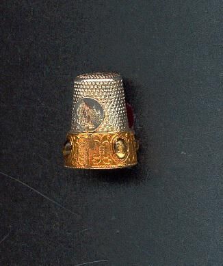 Continental silver thimble with applied gilt band. Gilt inside also. Band at lower edge has 5 amber coloured stones. Knurling to and over trop. Applied disc on body of thimble on knurling of a building - Cathedral? Where? Disc has silver content marked on it - 800. Three stampings in knurling which I canÕt read. Top center has a mark also unknown ,center circle with 5 circles around.