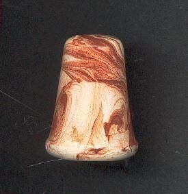 Tall nmotled, marbeled reddish brown and white ceranic thimble. Fluyted. Glazed outside Slight signs of top knurling.