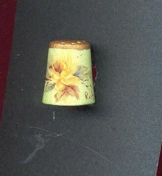 Hand painted pottery thimble. Green background with yellow roses and darker green leaves and brown stems. Gold top, flat, knurled. Inside unpainted. Matte finish overall. Inside printed in blackÓhand paintedÓ.