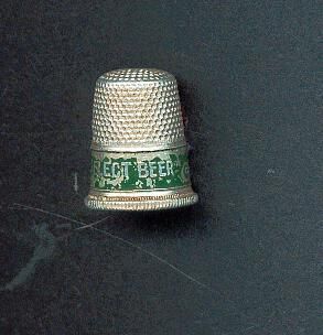 Aluminum Advertising thimble with vertically lined rolled rim. Green band with advertising ÒHeinrichÕ;s Select Beer*ÓAustria stamped in knurling above band.