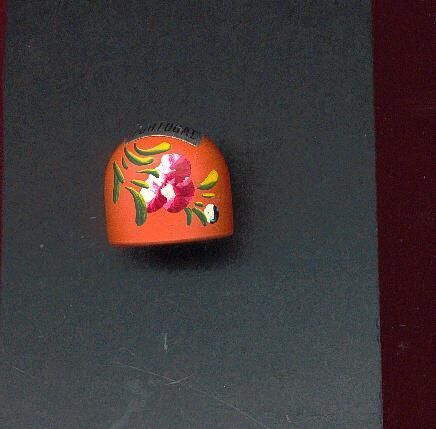 Dome shaped short pottery thimble. 3/4Ó high. with hand paintefd red and white flower , green leaves on the brick coloured thimble. Paper label with Portugal on top. No knurling.