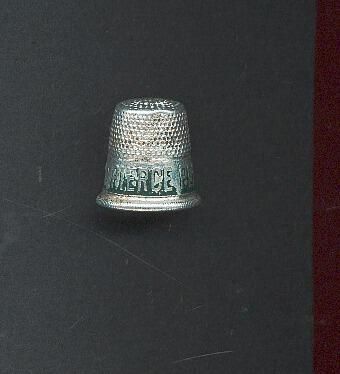 Aluminum Advertising thimble with rolled lined rim. Blue band with advertising ÒPierce Pennant Gasoline and Motor OilsÓ