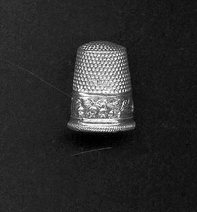 Aluminum thim,ble with rolled diagonally lined rim. Wide band of lioly-of-the-valley pattrtn on band. Knurling to and over top. No marks.
