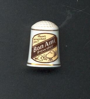 White porcelain glazed thimble, with domed top and fine - 24K - gold luine at rim. Original design advertising Bon Ami Powder. Inside logo for Franklin Mint 1980 Fine Porcelain.