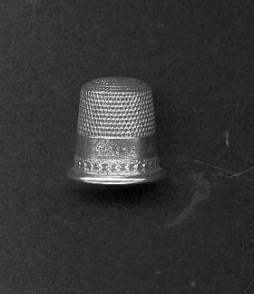 Silver thimble with rolled rim. Narrow band of pattern - entwined circles. Wider pla.in band above with trademark - *Star (Waite Thresher) and 12 and Sterlin g Silver