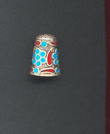 Silver enamelled thimble. Side seamed, added knurled top.Enamelled design in blue and red in silver wires - raised on body of thimble. Stamped 925 and 2324.
