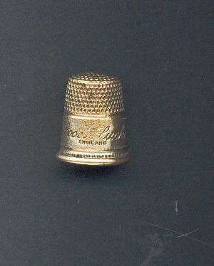 Brass thimble with rolled rim. Wide plain band above stamped with ÒGood LuckÓÕ and ÒEnglandÓ underneath - written, not printed. Band is 2/3 thimble then knurling to top and over.