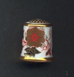 White glazed thimble with an Imari pattern . Slightly fluted with a gold band at rim. Slightly rounded top with star center and knurling marks in gold - not indented. Red, black and gold flower & leaf Inari pattern around thimble. Inside stamped in red ÒRoyal Crown Derby English Bone China Ò with logo and letter ÒLÓ