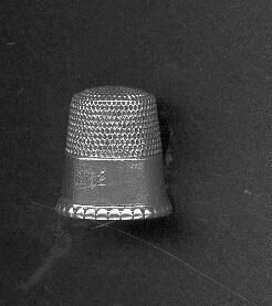 Silver thimble with raised patterned rim - mÕs around. Wide plain band above with Sterling andf 12 stamped on it. Knurling to and over top. No makers mark.