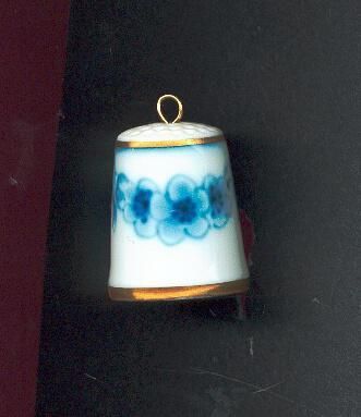 White porcelain thimble pendant.(no chain) Blue floral design around with bow and streamers. Gold band top and rim. Inside logo for Bing & Grondahl 4802 and Made in Denmark.Loof on knurled unglazed top for chain.