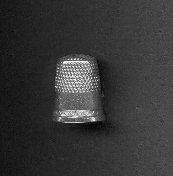 Nickel thimble with added narrow rim. Narrow band of pattern above rim - horizontal lines with zigzag on top. Very wide plain band above with size marked on it then knurling to and over rounded top.