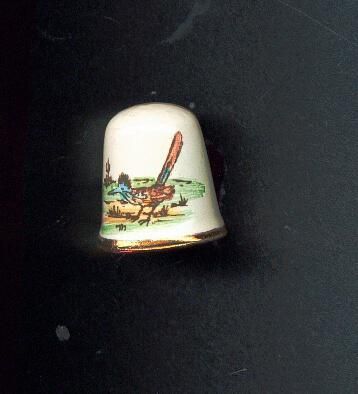 White pottery hand painted thimble with gold band at rim. Desert scene painted in body of thimble - Roadrunner and cactii. On back ÒCarefree AZÓ
