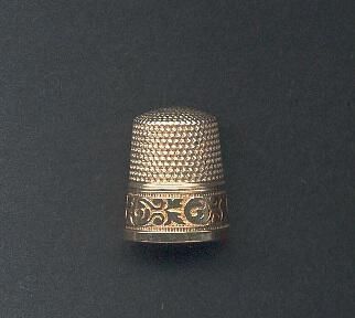 Silver thimble with gold band at rim. Wide gold band with cartouche. Scrolls and circles design. Knurling from band to and over top. Inside apex Simon Bros. logo with Sterling Silver around it. Size on band.