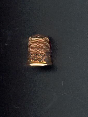 Gold thimble with rolled rim. Wide band of acanthus leaf pattern and cartouche. Initials ÒAESÓ Size . and CH (Charles Horner - maker) Date mark