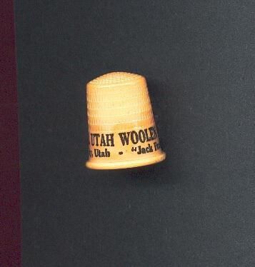Plastic Advertising thimble. Beige colour with black printing. Advertising Ò*Original Utah Woolen Mills Salt Lake City Utah Jack Frost BrandÓ Inside apex B&B St. Paul, U.S.A.