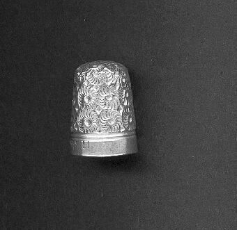 Silver clad steel type (Dorcas type) thimble. All over daisy pattern above plain band at rim. Stamped ÒDORISÓon band. Size on band. No makers marrk.
