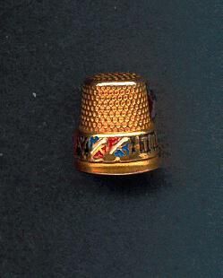 Souvenir brass, gold coloured thimble. Band of embossed geometric design. Enamelled work in red, blue, black and white with ÒToledoÓ worked in. Knurling ftom band to and over top.