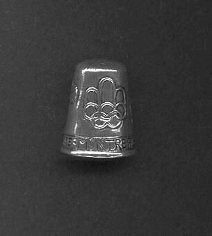 Heavy silver ,tall Souvenir thimble of the Olympics. Hand crafted. Raised rim. Top has maple leaf design on it. Around thimble a swimmer (or diver), basketball players, and the Olympic logo. Also ÒOlympic Games - Montreal - 1976Ó Inside ÒSterlingÓ.