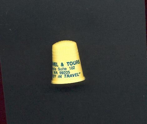 Yellow plastic Advertising thimble with green lettering. Advertising ÒSunset Travel& Tours W 1717 Francis Suite 102 Spokane, WA 99205 Your Best Buy in TravelÓ Inside top U.S.A. 17.