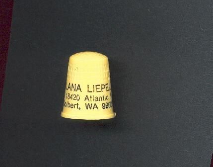 Yellow plastic Personal thimble with black printing. ÒAlana Liepelt N. 18420 Atlantic Rd. Colbert, WA 99005Ó Inside top U.S.A. 1