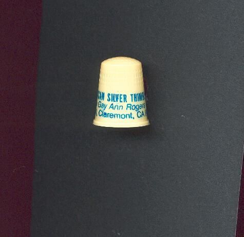 Cream coloured plastic Advertising and Personal thimble with green printing. On thimble above rim ÒAmerican Silver Thimbles Gay Ann Rogers Box 181, Claremont, CA 91711Ó U.S.A.11 in apex.
