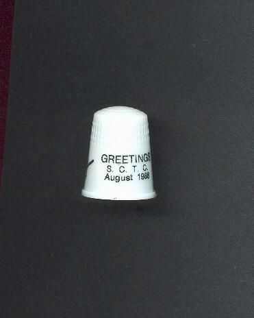 White plastic advertising thimble with black printing. Advertising ÒGreetings S.C.T.C. Aug. 1988Ó Also thimble picture with map of California and needle pointing to the south part with S.C.T.C.on it.