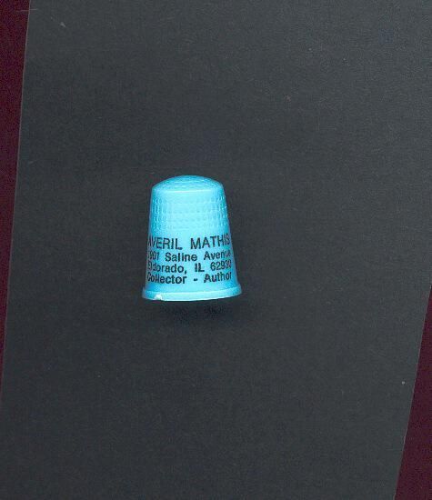 Blue plastic Personal and Advertising thimble with black printing.. Advertising ÒAveril Mathis 1901 Saline Avenue Eldorado, Il 62930 Collector - AuthorÓ U.S.A. 18 in apex.