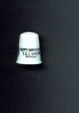 White plastic Advertising thimble with black printing. TCI logo in black with words ÒHappy Anniversary TCI 1978-1988, Spokane,WA.Ó U.S.A. 3 in apex.
