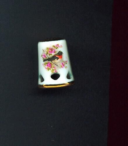 White glazed china thimble, slightly fluted at rim. Six triangular cutouts above hand painted wide gold rim. 2 bird decals, -each different birds, coloured amongst greenery on body of thimble. Top knurled and painted gold. No marks.