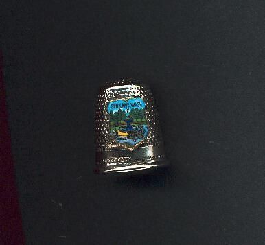 Silver coloured metal Souvenir thimble with rolled rim and added crest. Narrow plain band above rim with a very narrow lined band above and below then knurling to and over top. Stamped Germany and 18 oin band near rim. Added crest with trees, fountain and ÒSpokane Wash.Ó