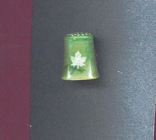Nephrite (B.C. Jade) thimble . Maple leaf etched onto body of thimble. Thimble is flared with slightly rounded Irregularly knurled top. Thin.