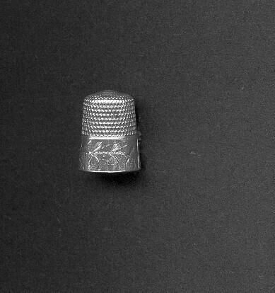 Silver thimble with wide band of leaves and flowers horizontally around thimble. Cartouche with initials IE . ÒSterling 8Ó stamped on band also. Knurling from band to and over top. Simon Bros. logo in apex.