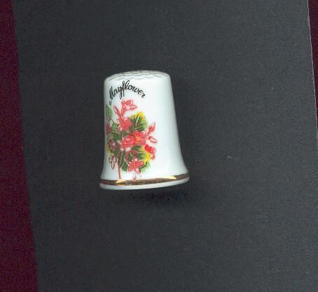 White glazed china fluted Souvenir thimble with gold band at rim. Decal of sprig of Mayflower on body of thimble - provincial flower of N.S. Inside stamped Japan.