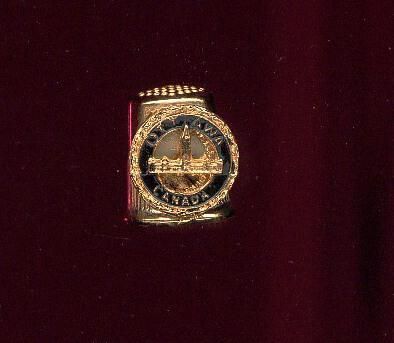 Gold coloured heavy metal Souvenir thimble. Rolled rim.Wide band of vertical lines above. Crest in gold and black of Parliament Buildings with ÒOttawa CanadaÓ in gold on black. No other marks.Crest seems to be part of thimble, not added. Thimble back of this crest is plain. Knurled flat top.