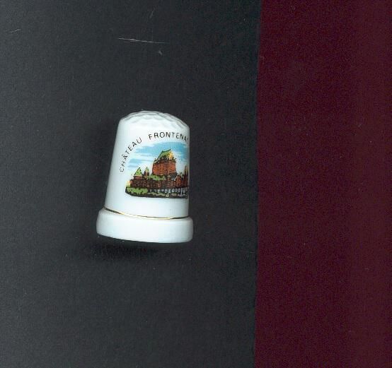 White glazed china Souvenir thimble with wide raised rim. Fine gold line at top of rim. Decal with picture of building and greenery with ÒChateau FrontenacÓ above. No marks.