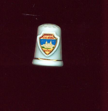 White glazed porcelain Souvenir thimble with wide raised rim. Fine gold line at top of rim. Crest in shape of shield . coloured red, blue, gold and white with decal of church with ÒBaslique Ste Anne QuebecÓ on it. This is built out as part of thimble. Knurling on slightly rounded top. No marks.