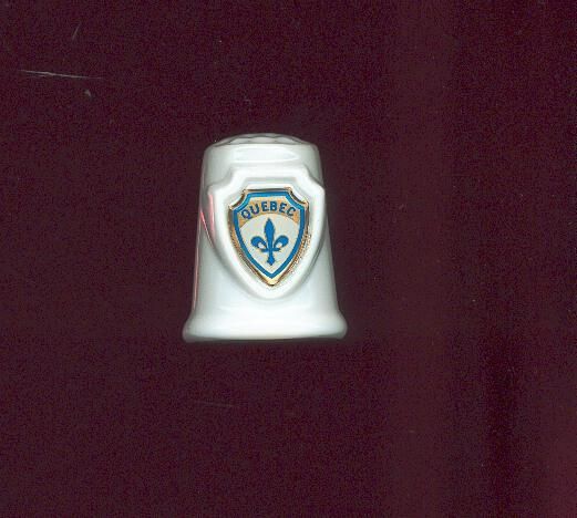 White glazed porcelain Souvenir thimble. Fluted with built -in crest. Coloured crest - blue, gold and white of fleur-de-lys and ÒQuebecÓ on shield. No other marks. Knurling over top.