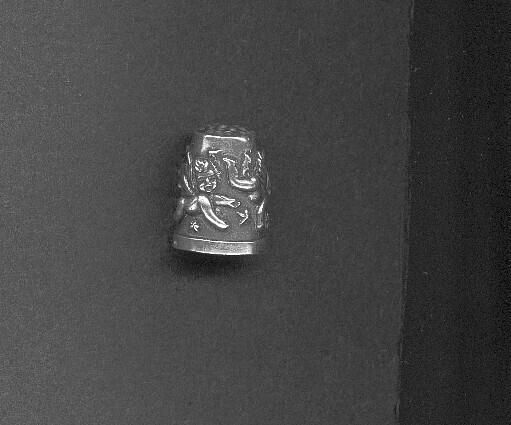 Silver thimble, with narrow plain rim. 3 cupids - or putte - around thimble with stars. top is slightly rounded and seems to be hand punched. Mark on rim CCN Inside apex 925.Side seamed ?