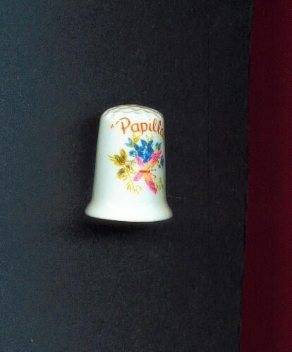 White glazed fluted china thimble. Print picture of a butterfly on flowerrs with the word ÒPapillonÓ in gold. No marks.