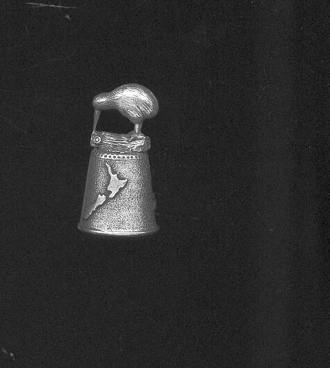 Pewter Souvenir thimble with Kiwi bird on top. Banner with New Zealand on body of thimble and raised maps of the 2 islands. No marks.