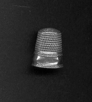 Silver thimble with wide rounded band at rim. Narrow wave scroll bands above and below wide band, then knurling to and over top. Inside top Sterling with small star - trademark of Waite Thresher.