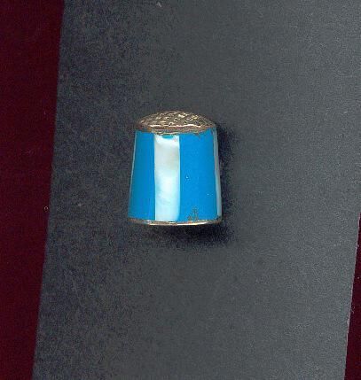 Mexican panelled thimble. Blue and white abalone (mother-of-pearl) panels on an alpaca base. Base is side seamed. Top slightly rounded and knurled in waffle style.