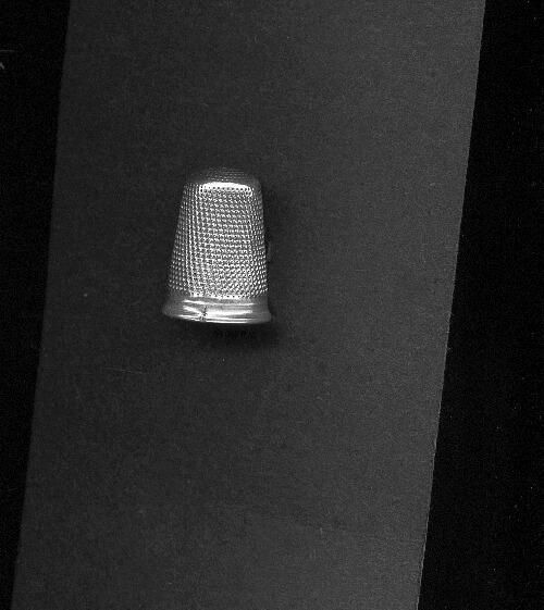 Tall silver thimble with rolled rim. Narrow plain band above rim.Knurling from band to and over top. No marks.