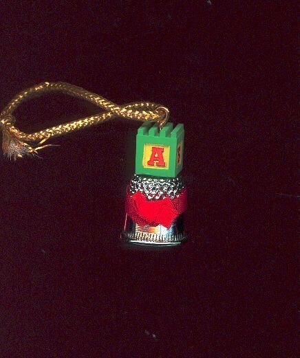 Christmas tree ornament called Tiny Toy Thimble. Metal , silver coloured, thimble with red ribbon bow. ChildÕs letter block on top with letters BABY around. Hanger on top. Box notes it is a 1986 Enesco made in Macau.