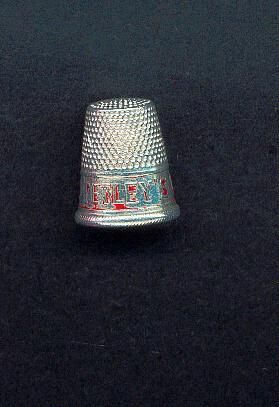 Aluminum Advertising thimble with rolled diagonally lined rim. Red band, mostly gone, advertising ÒTetleyÕs Teas Please*Ó No marks.