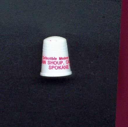 White plastic Advertising thimble with red lettering. Advertising ÒJean Shoup, California Spokane Ô88Ó U.S.A. 11 in apex.