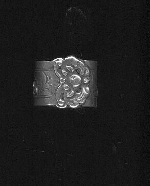 Oriental silver sewing ring thimble. Overlap has ddeply carved design - leaf and berry, bordered top and bottom by double lines. No marks.