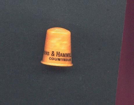 Early plastic Advertising thimble. Orange brown colour with black lettering. Advertising ÒBurns & Hammill Dry Cleaners Courteous Service*Ó Inside top B&B St. Paul U.S.A.